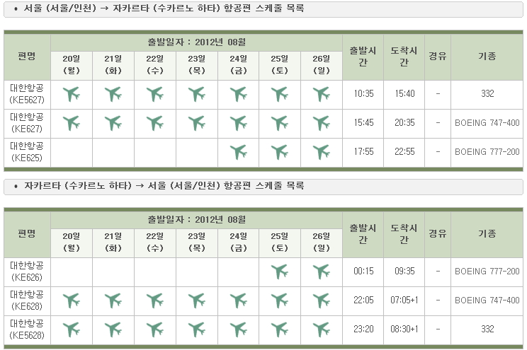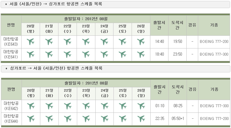 4. 위 ICN-SIN 구간 스케줄을 토대로 아시아나가 주9회 운항권을 가져간 것을 어떻게 배분할지 예측해 보겠습니다. 아시아나는 2005년 9월까지 인천-자카르타 노선을 운항하면서 주3회의 스케줄을 가지고 있었습니다.