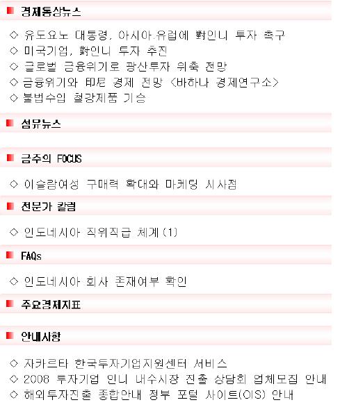 작성자 코트라자카르타무역관 쪽지보내기 메일보내기 자기소개 아이디로 검색 전체게시물 작성일08-10-25 09:55 조회5,233회 댓글27건첨부파일
