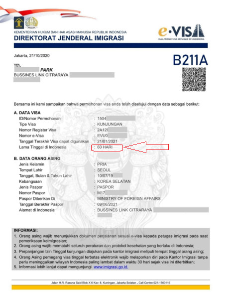 2. e-visa의 특징: 비자 승인서인 e-visa 텔렉스가 발행되면 e-visa 소지 후 인니